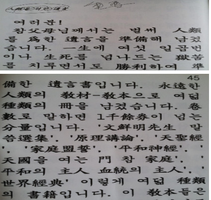하더라도 원리강론이 가정맹세문을 대신할 수 없고, 천성경이 가정맹세문을 대신할 수 없으며, 평화신경이 가정맹세문을 대신할 수 없다. 가정맹세문은