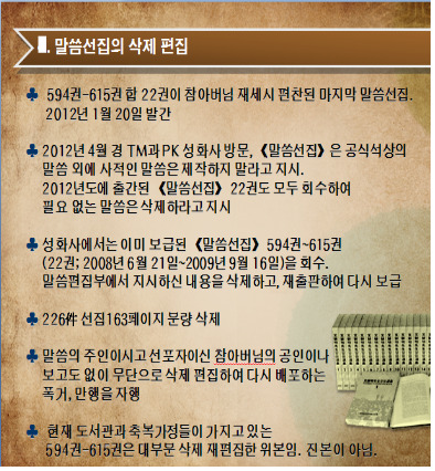 도데체 말씀선집 594권에서 615권에 무슨 말씀이 적혀 있기에 아버님 몰래 말씀선집 22권을 전부 회수하여 불편한 말씀을 삭제하고 재 편집 했는가? 참부모님 말씀편찬위원회』임원들은 허황된 주장을 생산하여 대역죄를 더 이상 짓지말고 삭제된 163페이지 분량의 내용이 무엇인지나 명명백백하게 밝혀라.