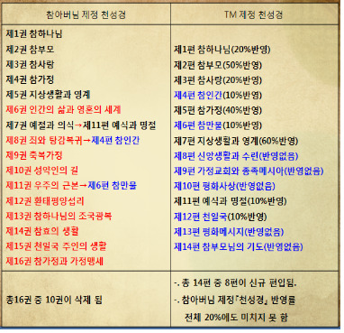 현 통일교지도부(참부모님 말씀편찬위원회)는 천성경 80% 이상 삭제는 어불성설이라고 주장했다. 아래 자료에 대한 실증적 반론을 제시하기 바란다. 정확한 자료와 근거를 중심으로 위 도표에 대해 비판을 해 보기 바란다.