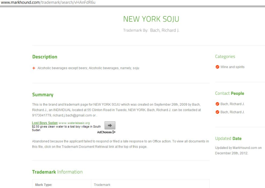조사한 결과에 따르면, 리차드 박 씨는 '뉴욕 소주'라는 상표권을 2009 9 26일에 등록하였고, '데어포