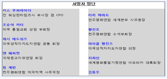 이 자들의 공개서신 내용은 2009년 3월8일 속초 천정원에서 아버님께서 현진님을 염려하시면서 공직을 박탈하실때의 염려의 말씀과 같다. 바로 이자들이 2009년 2월21일부터 2009년 3월5일 사이 즉, 불과 12일 사이에 아버님께서 현진님의 GPF활동을 섭리가 아닌 사적인 활동으로 집요하게 보고한 바로 그 당사자들의 세력으로 본다. 하여 나는 이자들을 하늘앞에 고소하지 않을 수 없다. 이 지도자들의 명단을 공개한다.