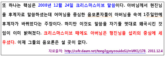 그런데 문제는 자기의 양심을 속여가며 말씀선집의 기술내용을 왜곡 조작하여 주장한다는 점이다. 통일교 신도들은 이자의 주장을 실제상황으로 인지하고 감읍해 하며 환호작약 한다. 예를 들면 이렇다. 2011.12.4일 말씀선집 내용을 또 다시 반복하여 주장한 내용이다.