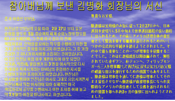 추신: 이 정황에서 보고를 받으신 아버님께서는 지도자들에게 미국 이사회 임원변경은 불가하다는 것을 표명하셨고 통일교지도부는 아버님의 지시를 현진님에게 통보했다고 주장하고 있음을 밝힌다.
