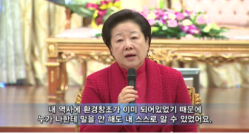 내 역사에 환경창조가 이미 되어 있었기 때문에 누가 나한테 말을 안해도 내 스스로 알 수 있었어요. 여기에 이의가 있어요? 내가 말했죠. 나는 어린 나이였지만 복귀섭리역사를 알았다고. 난 누구한테 교육받은 거 없어요. 근데 아버님 만나 뵙고 내 당대에서 이 복귀섭리는 완성해야 되겠다, 결심했어요. 어떤 어려움이 있더라도 내가 이거 못하게 되면 내 후손이 또 해야 돼, 나는 후대를 위한 환경창조를 열심히 했어요.