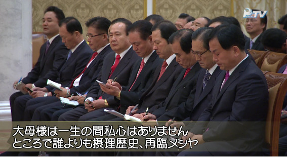 이어서 어머님은 그로부터 13일 뒤인 즉, 2015년 12월 25일에 천정궁에 송영석 일본 협회장을 비롯한 일본 지도자들이 참석한 자리에서 어머님은 아버님을 만나기전부터 어머님의 사명, 어머님이 이뤄야 할 일을 다 아셨다고 주장하셨다.