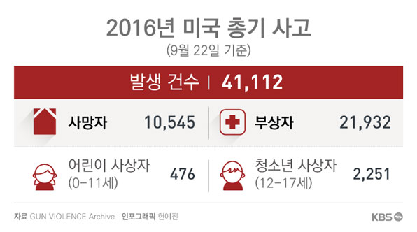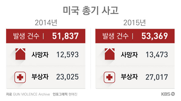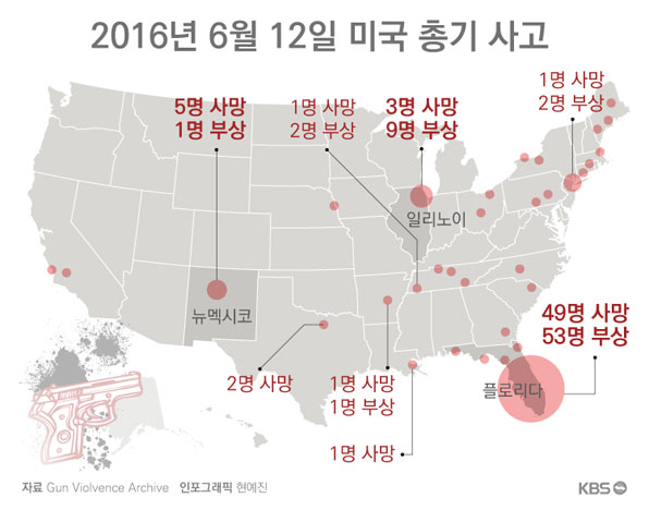 문제는 술을 사는 것보다 총을 사는 게 더 쉽다는 말이 나올 정도로 총기 구매와 휴대가 자유로운 미국 사회에서 이런 충돌은 언제든지 발생할 수 있는 흔한 사건이 돼 버렸다는 점이다. 미국에서 일어나는 총기 사고를 실시간으로 수집해 분석하고 있는 온라인 사이트 총기 폭력 기록 보관소(GUN VIOLENCE Archive)의 집계를 보면 올해 경찰의 법 집행 과정에서 총기 사고로 숨지거나 다친 사람이 경찰 232명, 시민 1,353명 등, 모두 1,585명이나 됐다. ![]() ![]() 올해 벌써 만 명, 하루 평균 40명씩 총 맞아 사망 법 집행 과정이 아닌 미국 사회에서 일어나고 있는 전체 총기 사건을 분석해보면 그 상황은 훨씬 더 심각하다. 지난 22일 (현지시각)까지를 기준으로 올해 미국에서 발생한 총기 사건은 무려 4만 천여 건에 이른다. 지금까지 총기 사고로 1만 5백여 명이 숨졌다. 하루 평균 40명이 총에 맞아 숨진다는 얘기다. 총기 사고로 인한 부상자도 2만 천여 명이나 된다. 하루 평균 80명꼴이다. 총기 사고로 숨지거나 다친 사람 가운데에는 17세이하 청소년이나 어린이 2천 7백여 명이 포함돼 있다. ![]() 미국에서의 총기 사고는 일상화된 지 오래다. 플로리다 주 올랜도나이트클럽 총기 난사 사건이 일어난 6월 12일을 한번 되돌아보자. 총기 난사로 49명이 숨지고 53명이 다쳤던 플로리다주 올랜도의 한 나이트클럽 총기 난사 사건은 미국 역사상 최악의 총기 난사 사건이었던 만큼 언론들의 집중적인 조명을 받았다. 하지만 그날 미국에서 일어난 총기 사고는 그뿐만 아니었다. 비록 언론의 주목을 받지 못했지만, 당일 발생한 총기 사고는 42건이 더 있었다. 이날 추가적인 42건의 총기 사고로 18명이 숨졌고 41명이 다쳤다. 숨진 사람 가운데는 어린이 5명이 포함돼 있었다. 6월 12일 발생한 42건의 총기 폭력 사건은 서부 캘리포니아에서 동부 메인 주까지 16개 주에 골고루 퍼져 있다. ![]() 뉴멕시코 주에서는 한 남성이 총기로 부인과 4명의 자녀를 살해했다. 4명 자녀의 나이는 각각 14살, 11살, 7살, 그리고 3살에 불과했는데 그들은 집에서 친척에게 발견됐다. 5명을 살해한 남편은 도망쳐서 아직도 거리를 활보하고 있다. 일리노이 주 시카고에서는 7건의 총기 사건이 발생해 3명이 숨지고 9명이 다쳤다. 한 사건의 경우 두 사람이 시카고 남부 지역에서 현관에 앉아 있다가 총에 맞아 살해됐다. 이들은 역시 총기로 살해된 친구의 장례식에 참석한 뒤 집에 돌아와 곧바로 살해됐다. "그는 예의 바른 친구였고 좋은 아빠였는데 그는 잘못된 시간에 잘못된 장소에 있었을 뿐이었다"고 그들 친구 중 한 명이 시카고 선타임스에 말했다. 이처럼 6월 12일이 총기 사고와 관련해 미국에서는 '특별한 날'이 아니라는 것이다. 올랜도 총기 난사가 끔찍하고 전례가 없는 사건이었지만 사상자 수의 측면에서는 미국에서 매일 매일 일어나는 총기 사고에서 크게 벗어나지 않았다. 꾸준히 늘고 있는 미국 총기 사고 미국에서의 총기 사고는 꾸준히 늘어나는 추세를 보이고 있다. 지난 2014년에는 5만 천여 건의 총기 사고가 발생해 3만 5천여 명이 숨지거나 다쳤고 지난 2015년에는 총기 사고 건수와 사상자 수가 2014년에 비해 늘었다. 또 현재 추세대로라면 올해 사상자 수도 2015년을 넘어설 것으로 우려되고 있다. ![]() 미국의 총기 사고가 일상화된 건 미국이 헌법에서 총기 보유와 휴대의 권리를 보장해주고 있기 때문이다. 현재 미국인들은 약 3억 정의 각종 총기를 보유하고 있는 것으로 추정되고 있다. 어린이, 여성을 포함해서 미국 모든 인구와 맞먹는 숫자이다. 총기 사고가 심각한 상황이지만 미국에서 '자유로운 총기 구매'를 보장한 수정 헌법 2조를 개정해야 한다는 목소리를 내고 있는 유력 정치인은 아무도 없다. 총기 구매 과정에서 신원 절차를 강화해야 한다는 주장만 가끔 나오고 있을 뿐이다. '자유로운 총기 휴대'의 이면에 미국 건국의 역사, 자신을 지켜야 한다는 문화, 돈, 권력 등이 종합적으로 얽혀있기 때문이다. "우리나라에서 총기 사고가 자주 나기를 원하는지 우리 스스로 결정해야 합니다." 총기 규제에 엄격한 태도를 보이고 있는 미국 오바마 대통령이 기회 있을 때마다 하는 말이다. 이에 대한 미국 국민들의 답은 뭘까? 김의철기자 ( kimec@kbs.co.kr) |