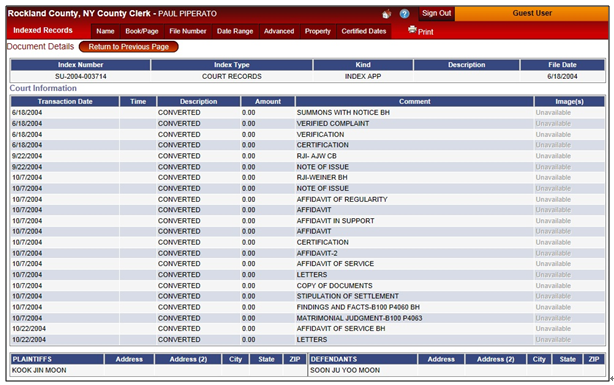확인할 수 있다고 했다. 실제로 웹사이트 주소로 들어가 인덱스 번호(Index Number) SU-2004-003714를 입력하였더니 자세한 이혼소송 기록을 확인할 수 있었다.