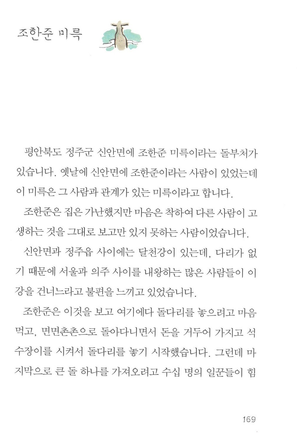 이와 같은 권위있는 분이 저술한 책 속에 조한준 미륵 이야기가 담겨 있었다. 조한준 미륵에 관한 이야기는 이 책의 169쪽에서 174쪽에 실려 있었다. 그런데 자세히 읽어보니 교회에서 말하는 내용과 다른 부분이 많았다. 교회에서는 조한준이라는 사람이 부자이고 자기 사재를 다 털어 돌다리를 놓았으며 다 쓰고 남은 엽전 세푼으로 집신을 사 신었다고 말하는데, 이 책에서는 조한준이 가난한 사람이고 다리를 놓기 위해 사람들로부터 모금을 했으며, 그 모은 돈에서 엽전 두 푼을 취해 집신 한켤레를 사 신었다고 설명되어 있다. 그 외에도 여러 부분에서 이야기가 달랐다.