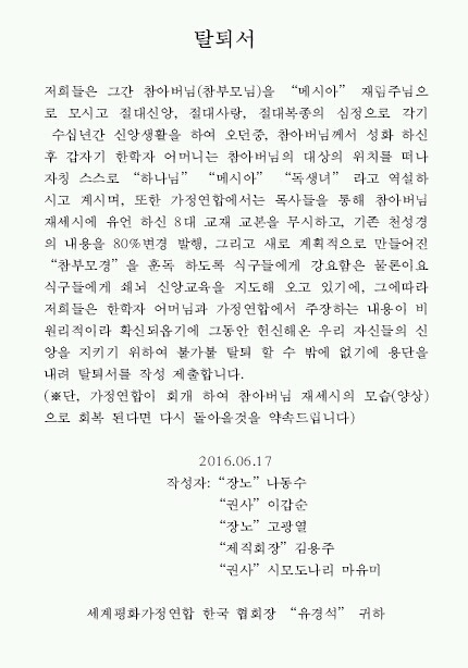그러니 탈퇴하는 축복가정은 빨리 소속교회를 밝히고 죄의 심판을 받고, 축복가정의 자리로서의 시민권을 자진 제출하십시요!